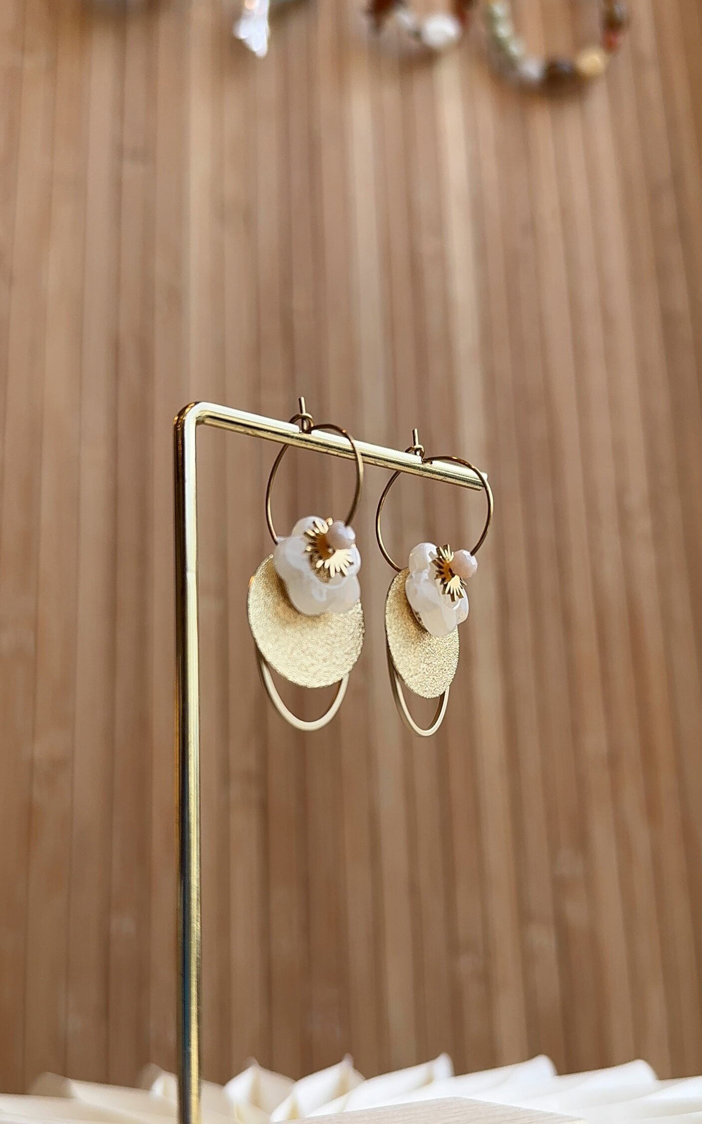 Supports en acier inoxydable, disques et anneaux en laiton doré à l’or fin, perles en résine