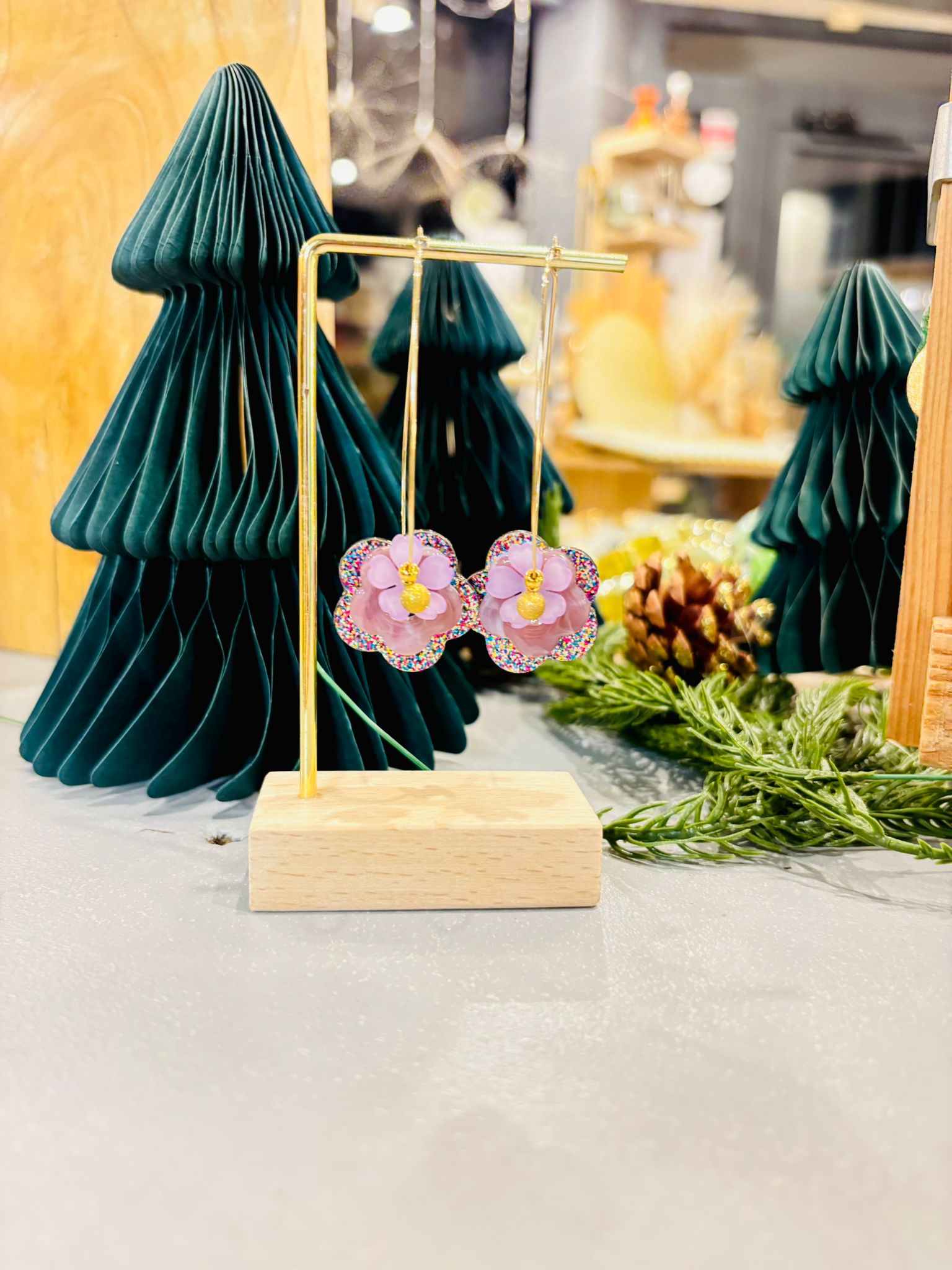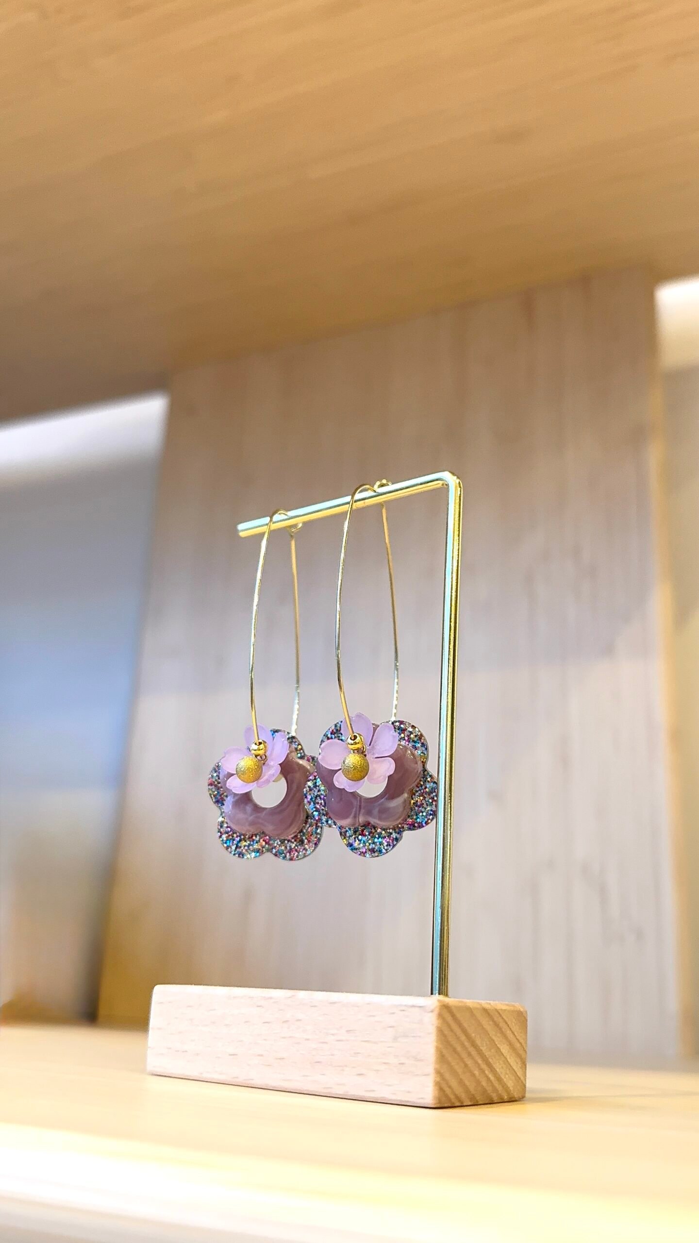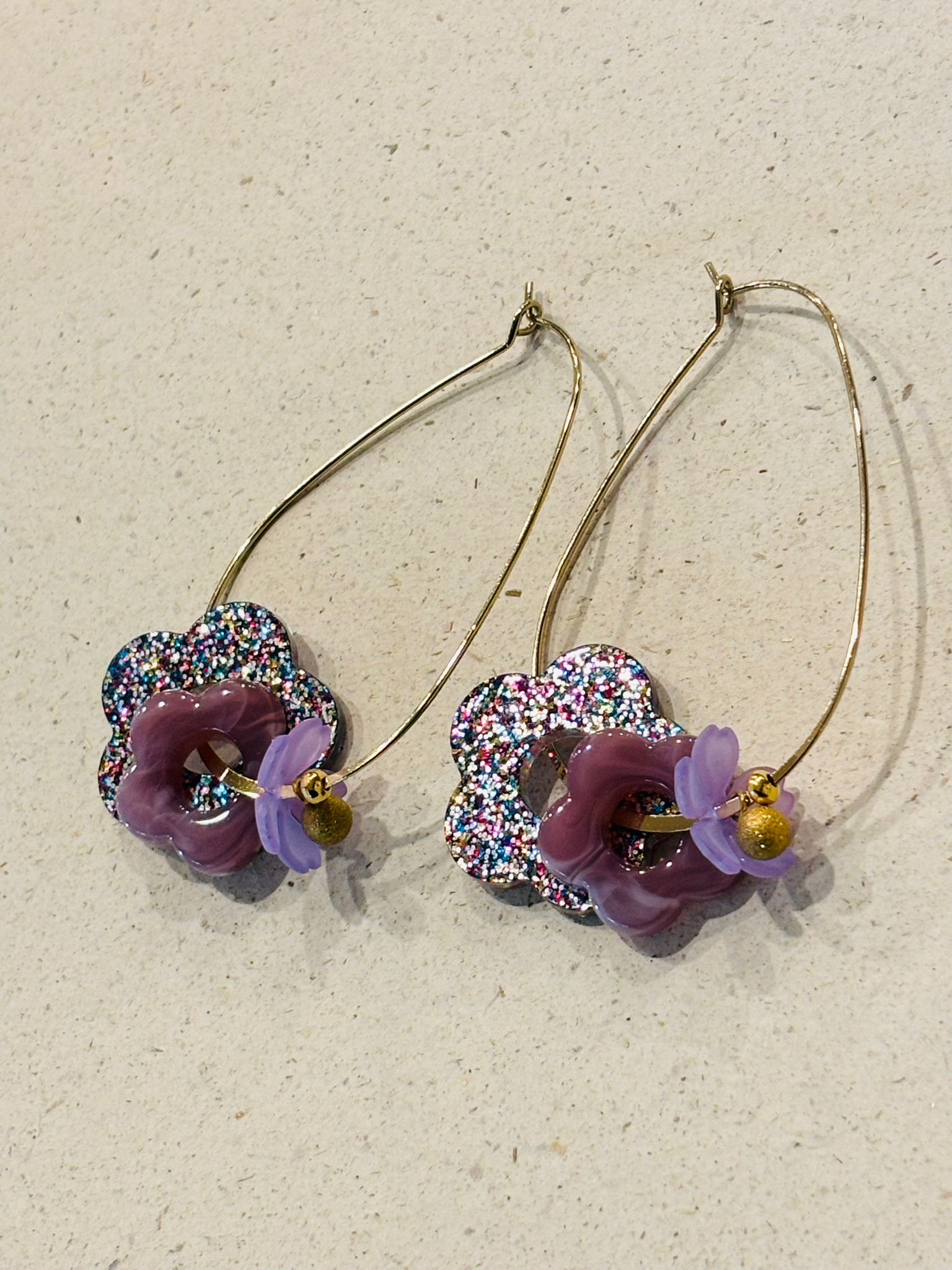 Supports en laiton doré à l’or fin, perles en résine