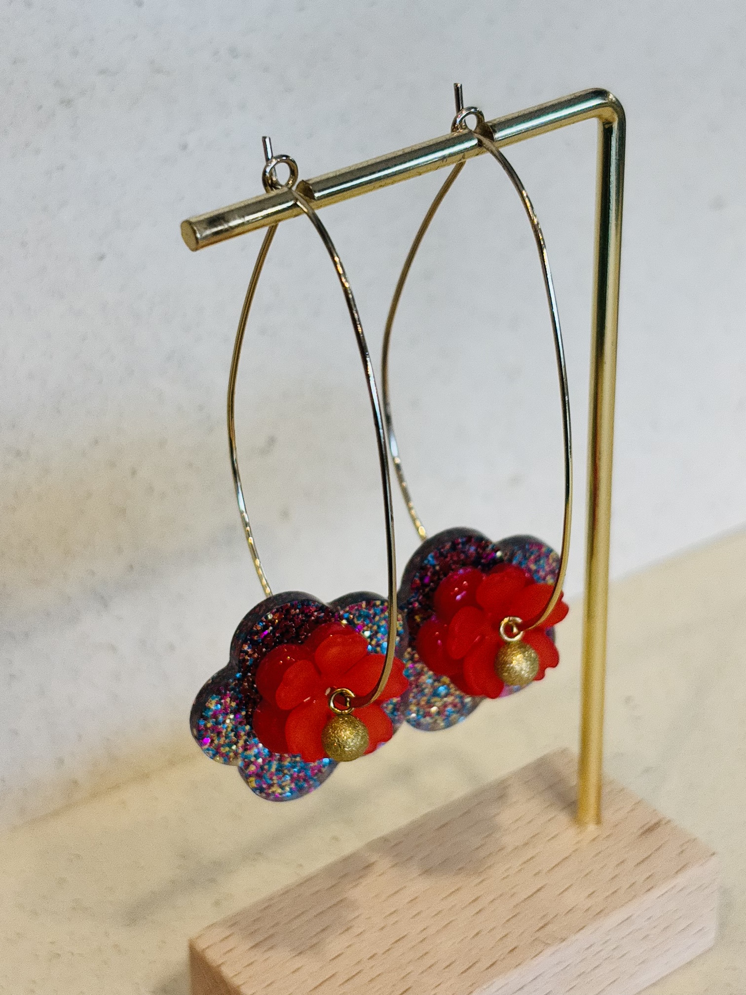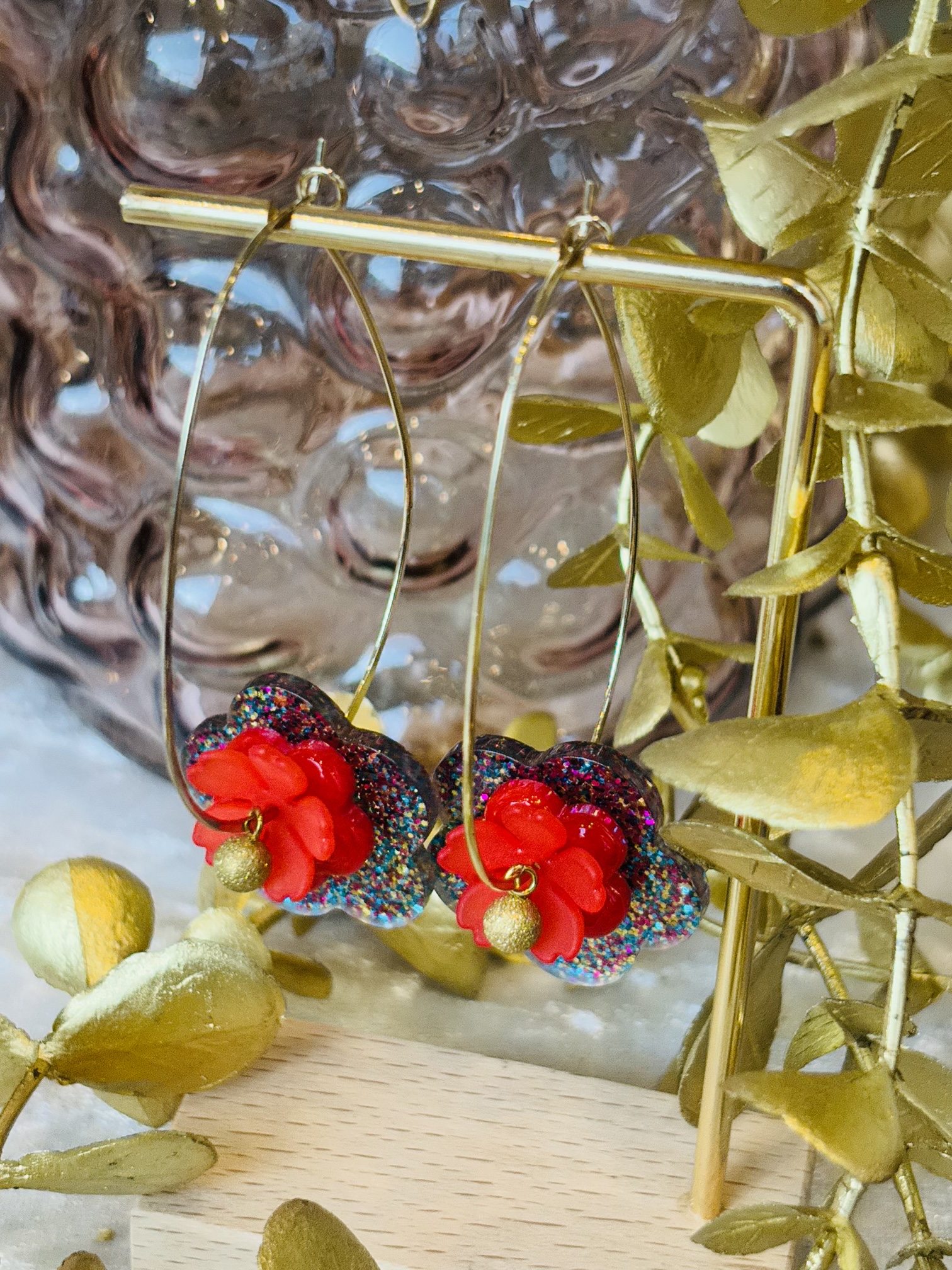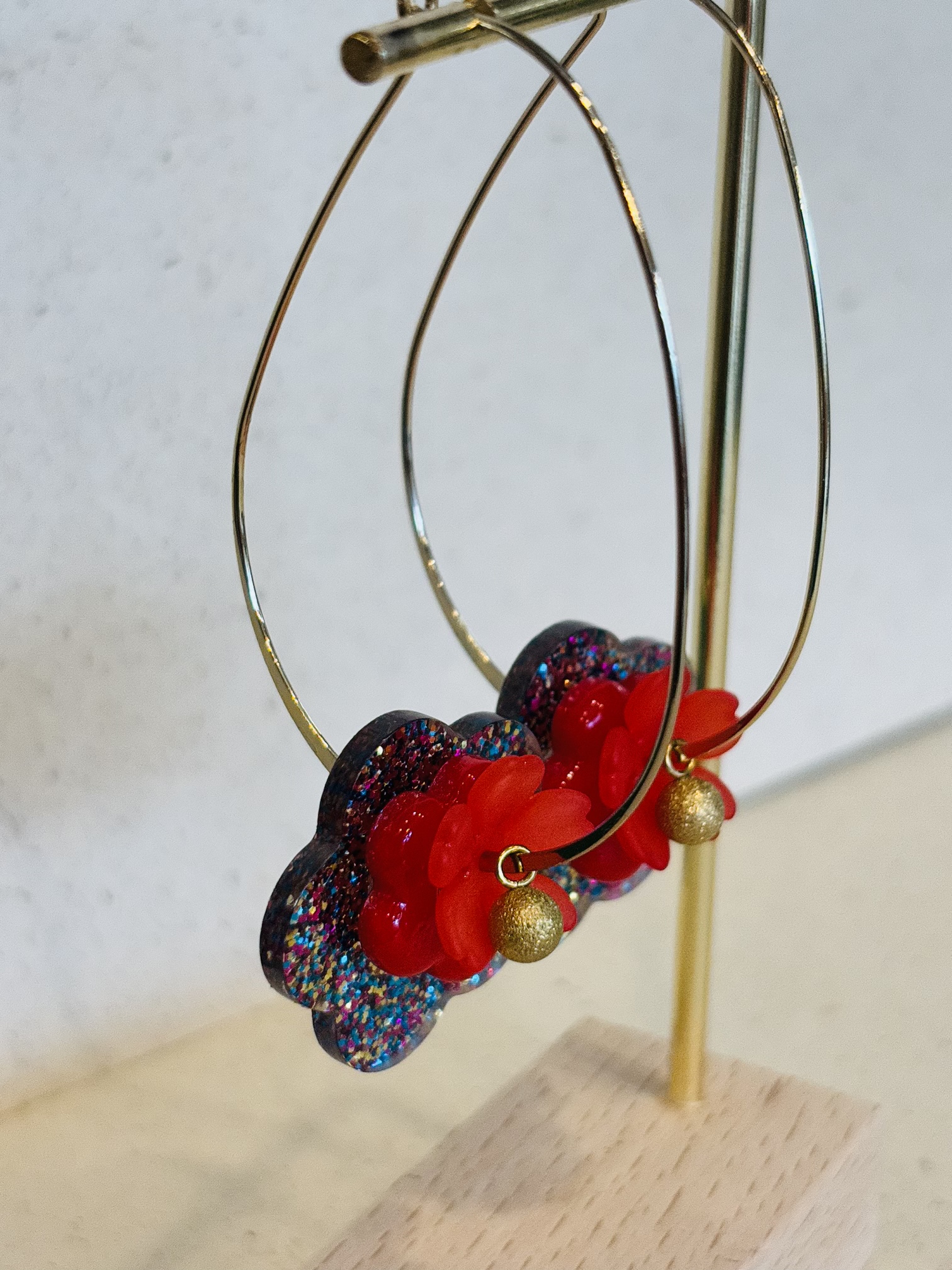 Supports en laiton doré à l’or fin, perles en résine