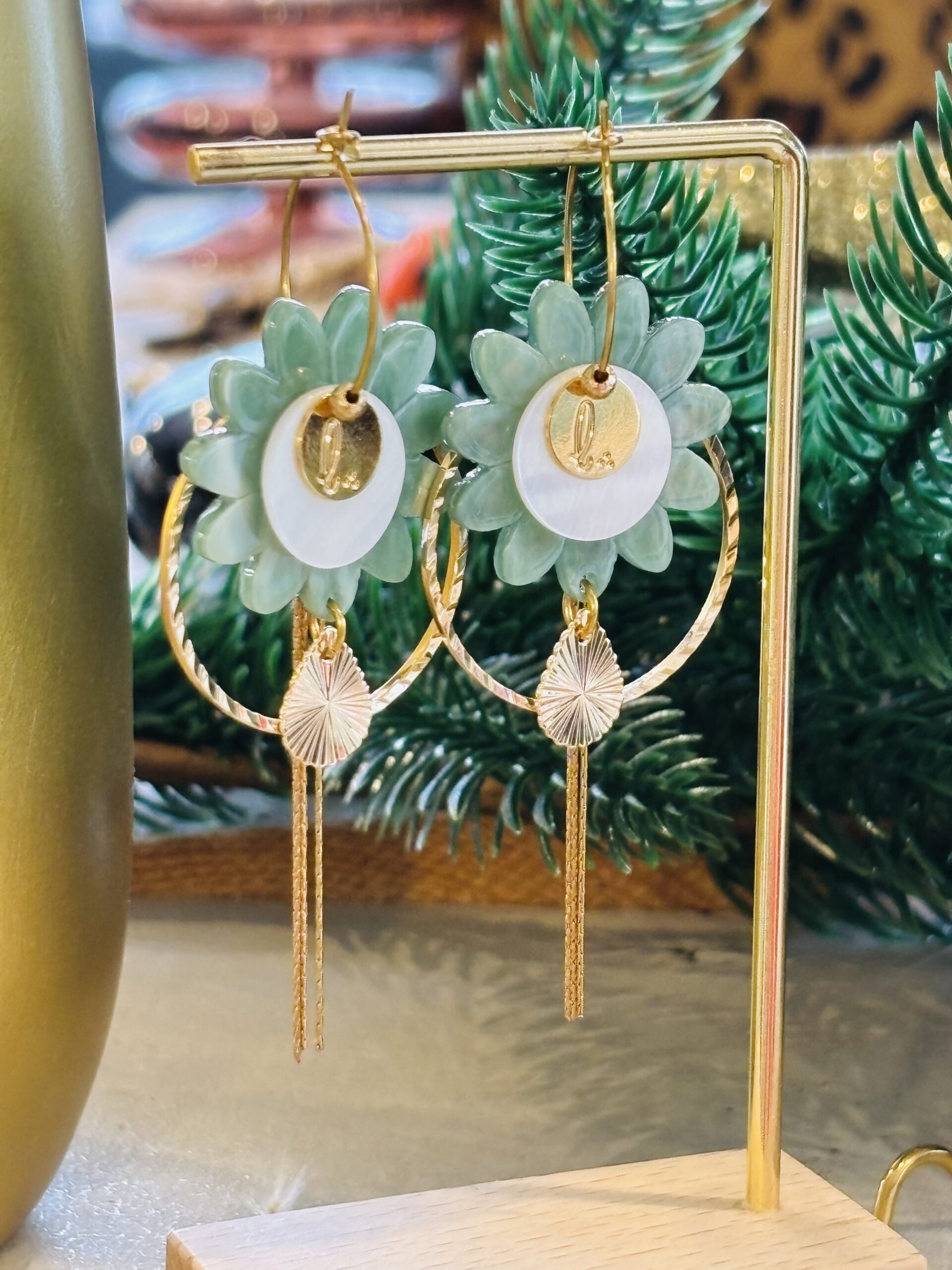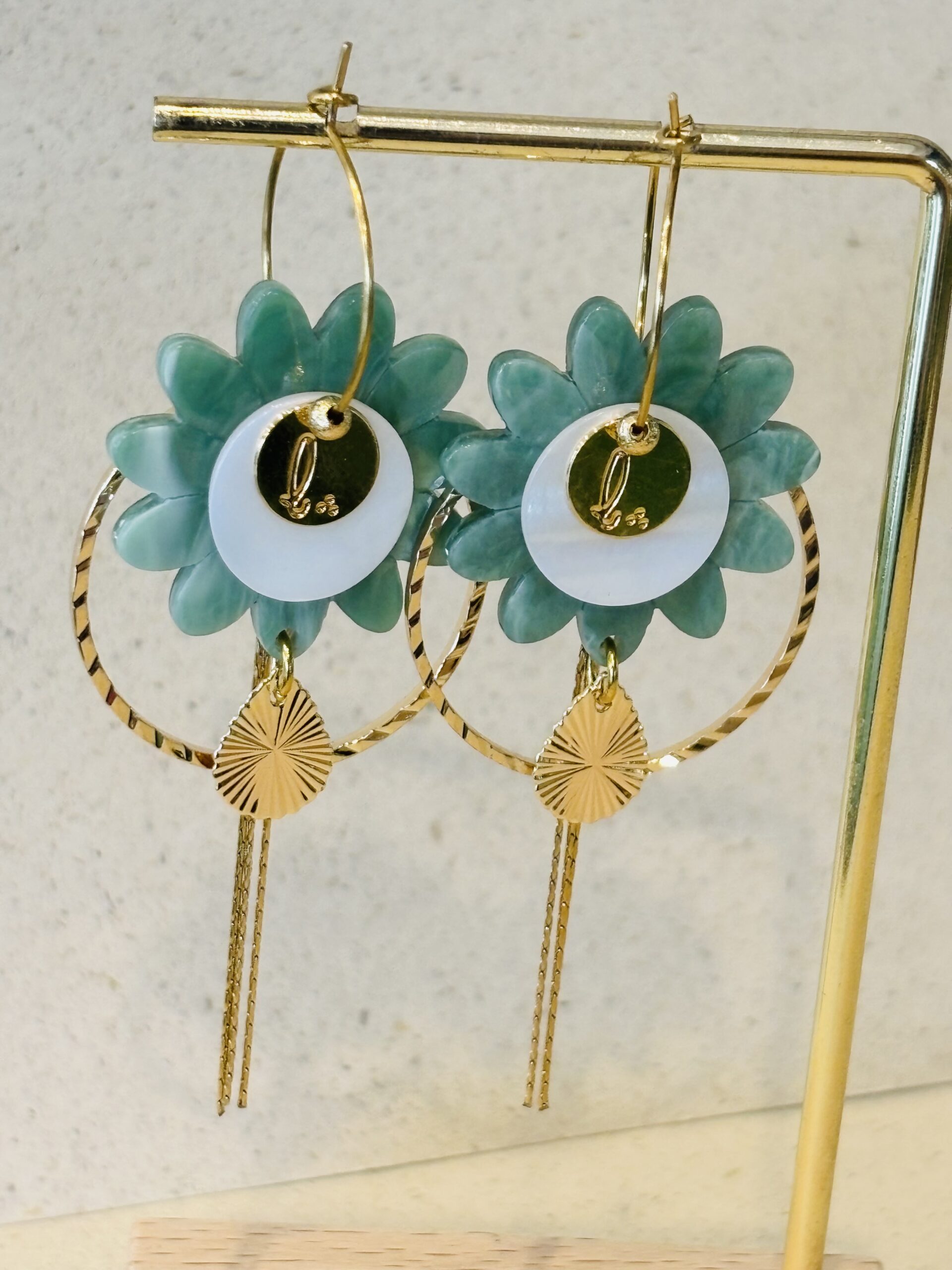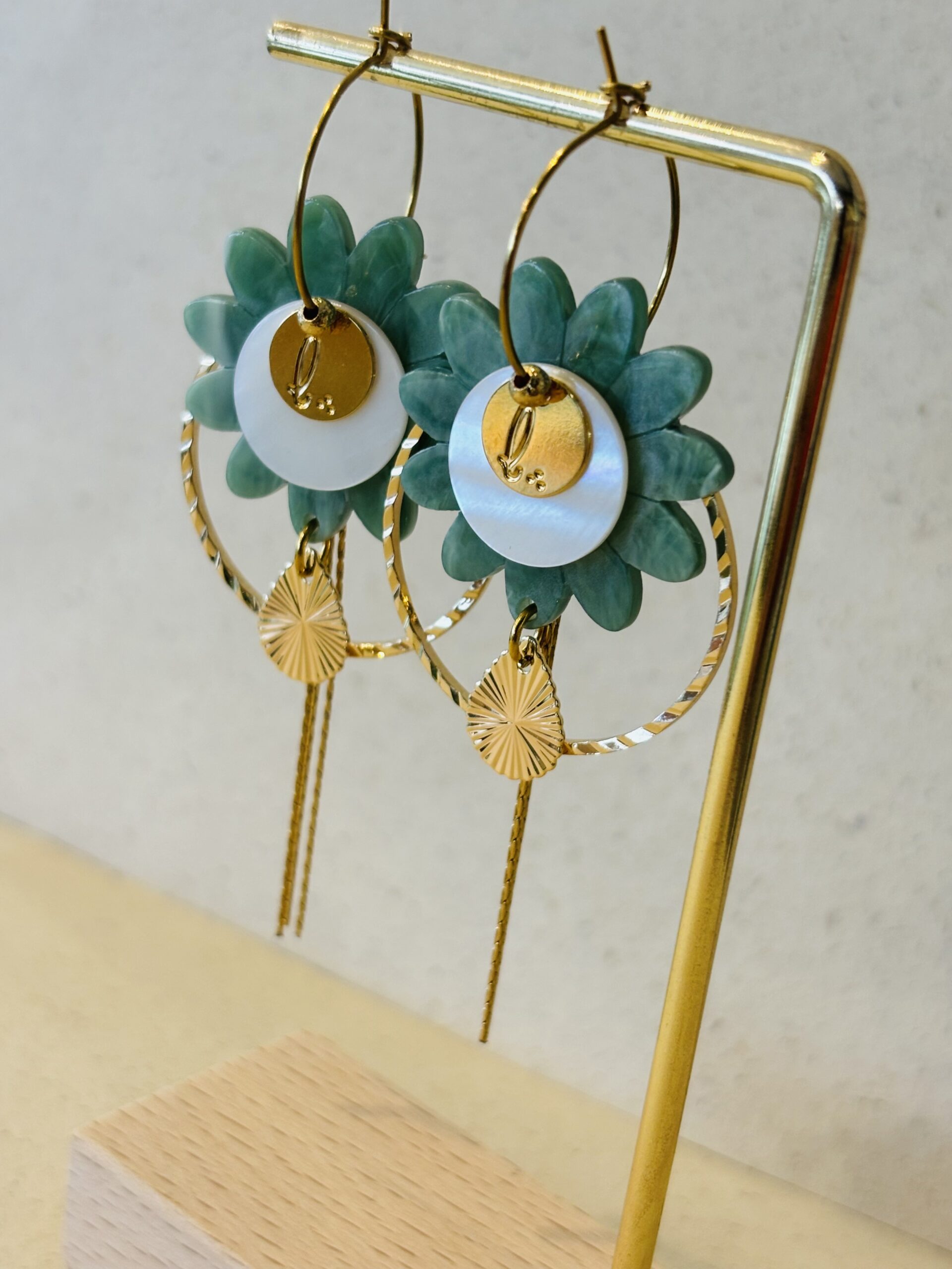 Supports en laiton doré à l’or fin, perles en résine, nacre