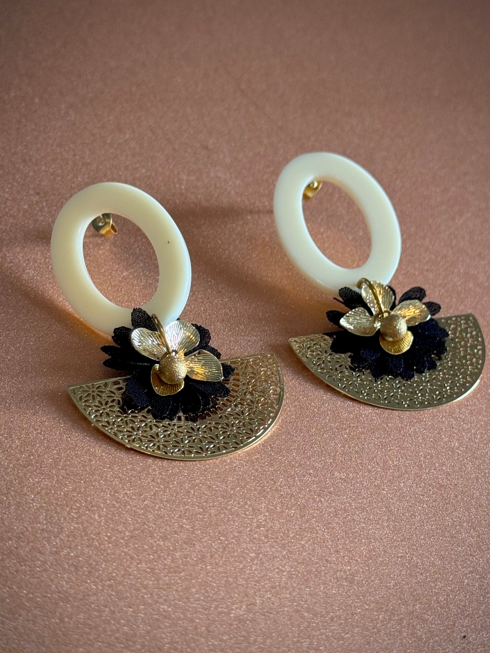Supports résiné en laiton doré à l’or fin, perles en résine, tissus