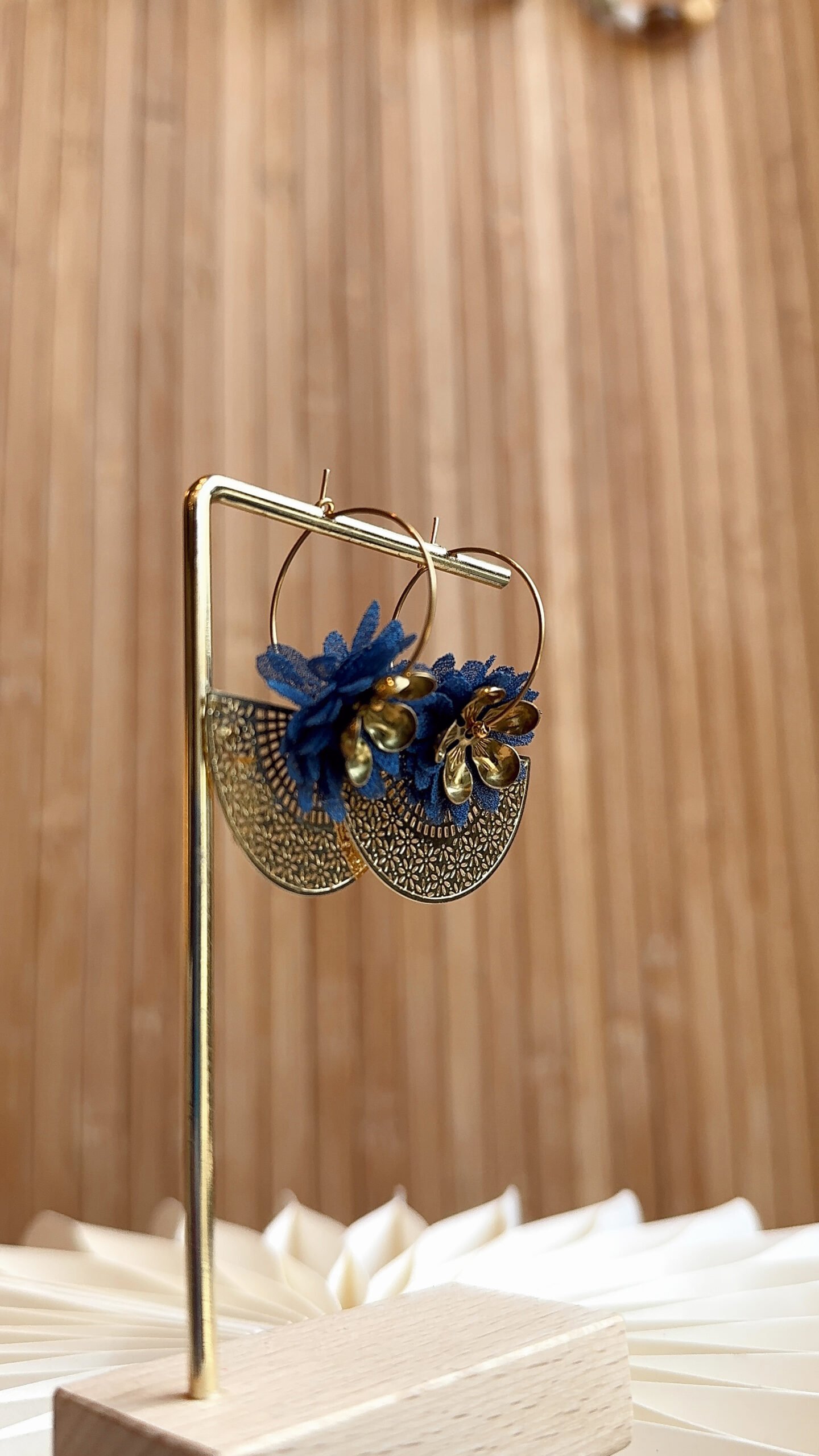 Supports en acier inoxydable, estampes en laiton doré à l’or fin, fleurs en tissus