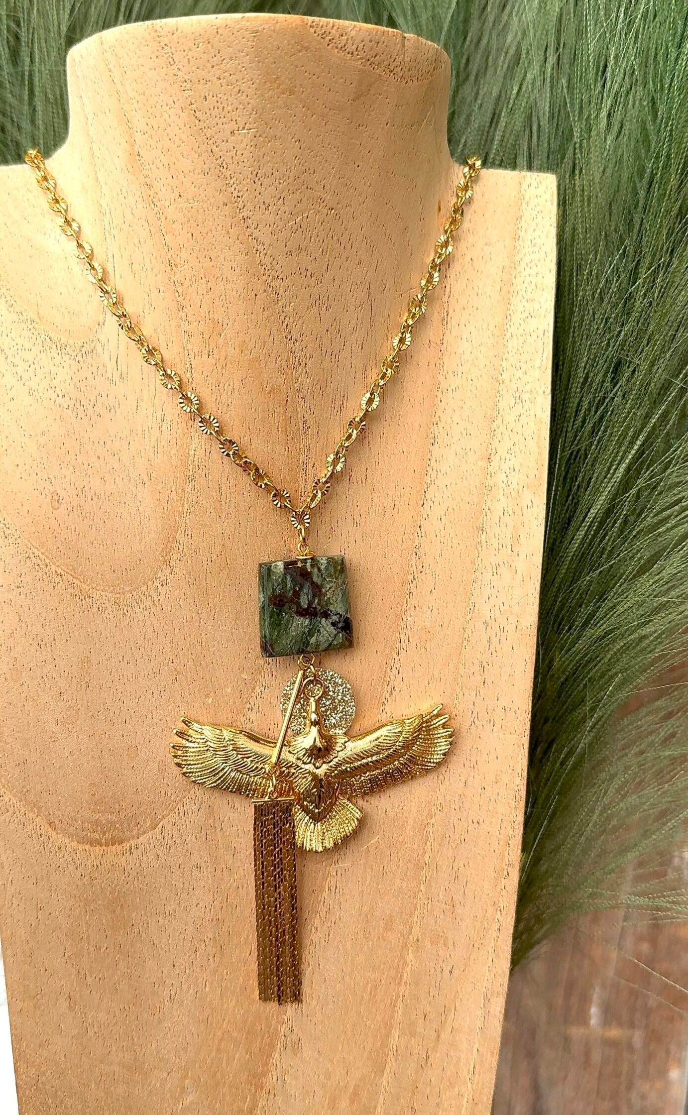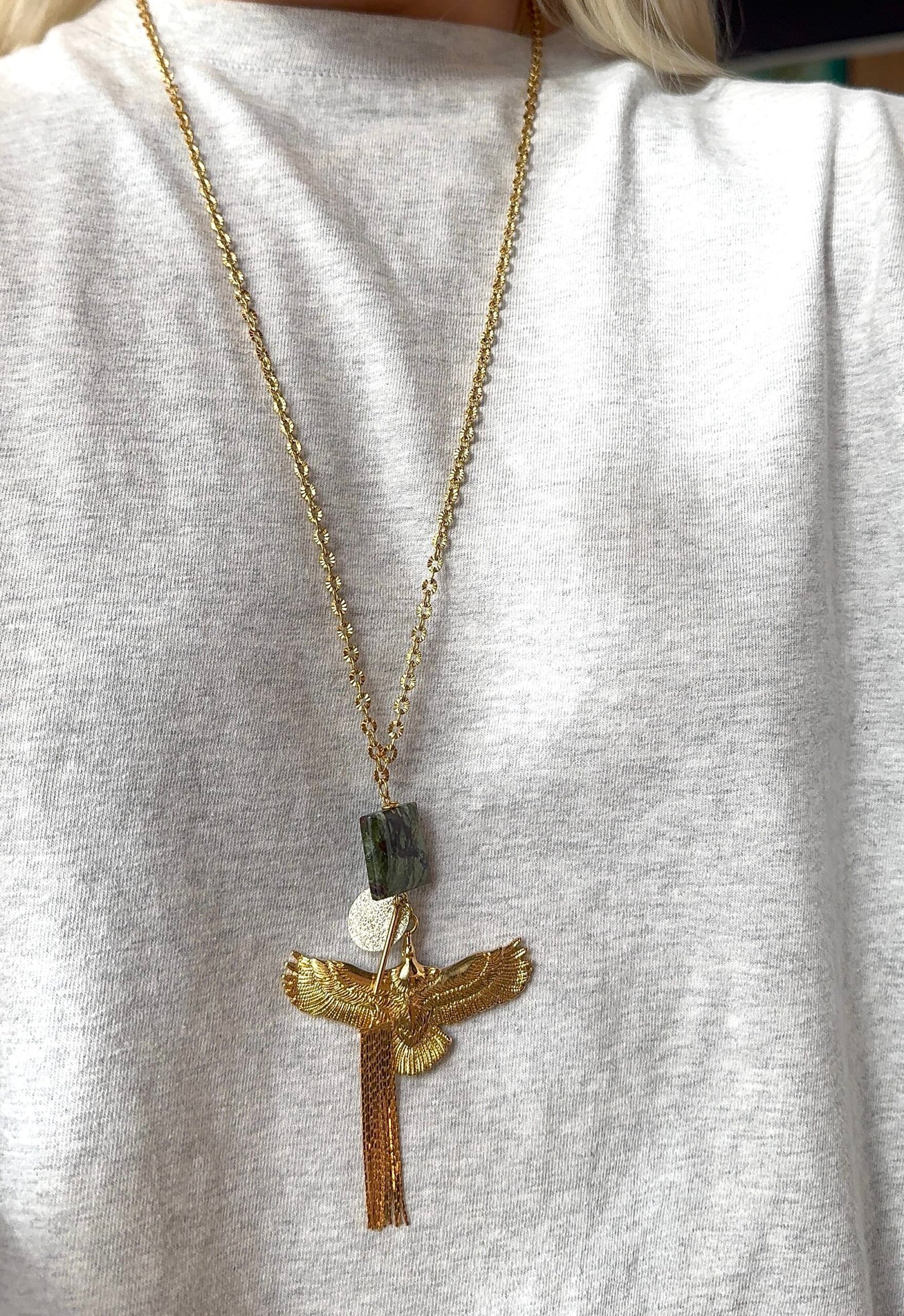 Chaîne et attaches en acier inoxydable, frange en laiton doré à l’or fin, pierre naturelle